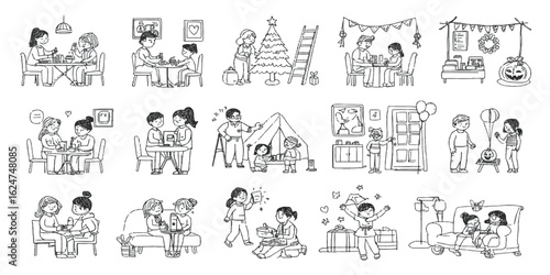 Family tradition and holiday activity icon set including seasonal decor, celebrations, outdoor fun and cozy home rituals. Features pumpkin carving,, vector illustration