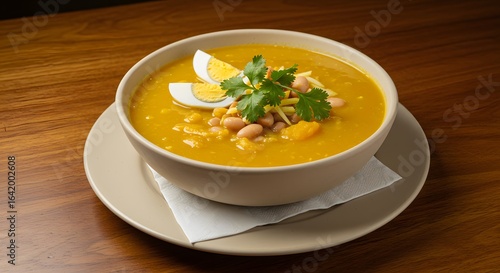 Fanesca pumpkin bean fish soup on a restaurant table