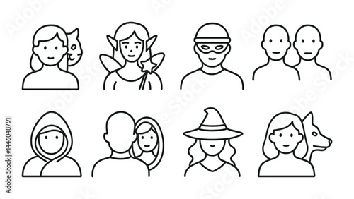 Fantasy character outline icons set – line style mythical, magical, and legendary figures for creative design: fairy, witch, hero, villain, wolf, mask, duo, wizard.