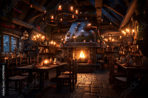 Fantasy medieval tavern inn interior with bread, food and drink on tables, burning open fireplace, candles and moonlight through a window, medieval pub inside at night. generative ai