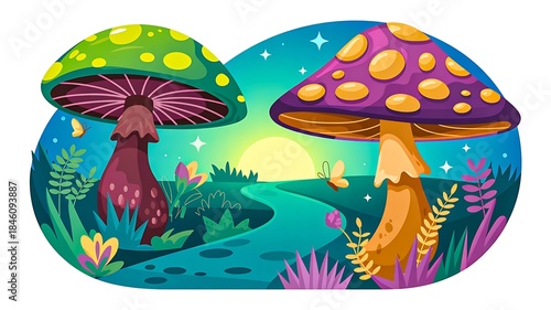 Fantasy mushroom forest illustration with colorful nature scene