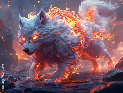 Fantasy World White Wolf with Magic Flames. The Great Power of Flames.