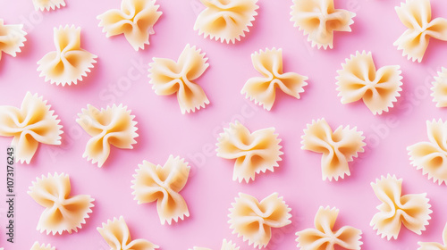 Farfalle pasta, top view, light pink pastel background, copy space. Food concept. Generative AI