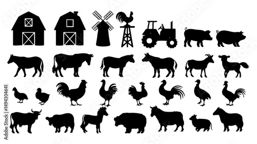 Farm animals and buildings silhouettes vector illustration for agriculture and livestock design elements