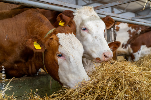 Farm cows enjoy fresh hay in a spacious barn, highlighting rural life and agricultural practices during the day