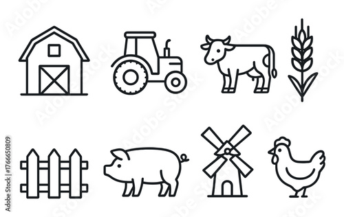 Farm icons set: barn, tractor, cow, wheat, fence, pig, windmill, chicken