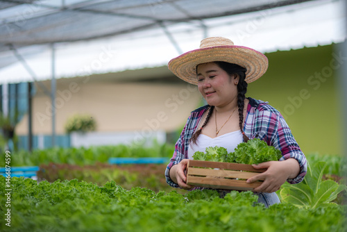 Farmer or gardener woman working lush green greenhouse garden carries wooden crate freshly harvested lettuce sustainable agriculture organic farm project growing fresh and care yield healthy produce.