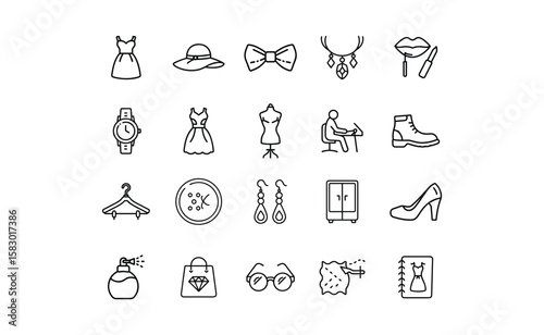 Fashion and Design Line Art Icons: Clothing Accessories and Creative Tools.