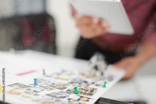 Fashion designer with digital tablet examining story board in office