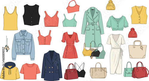 Fashion essentials, women clothing, stylish outfits, trendy dresses, modern bags, cozy jackets, chic tops, casual wear, cad drawing flat vector illustration