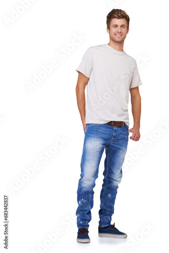 Fashion, smile and portrait of man in a studio with casual, stylish and trendy outfit for confidence. Handsome, happy and full body of model with tshirt and jeans style isolated by white background.