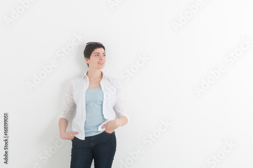 Fashion young woman wearing dark blue jeans and white shirt with sunglasses on her head looking up, smiling and dreaming with hands in her pockets