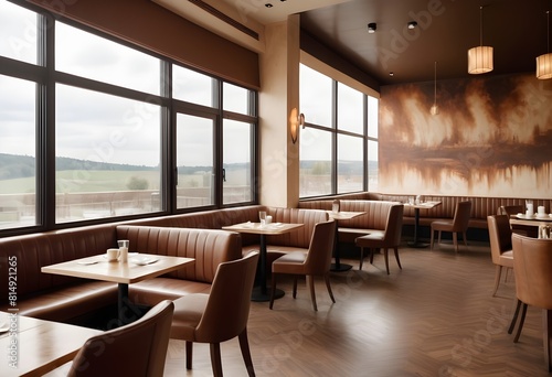 Fashionable and inviting cafe interior with designer chairs, refined dining tables, a plush sofa, and panoramic windows overlooking an inspiring outdoor view. An unadorned wall is available for a mock