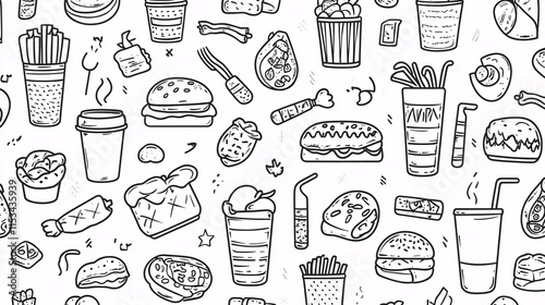 Fast food seamless pattern with hand drawn doodle elements. Vector illustration.