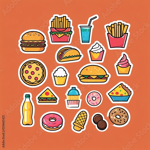 Fastfood stickers. Cartoon junk food snack labels, unhealthy meal with french fries pizza burger sandwich hot dog ice cream food, restaurant menu elements. Vector isolated set