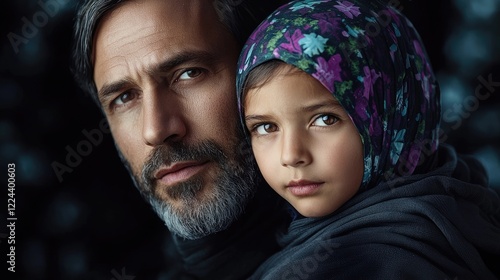 Father and daughter portrait, close-up, dark background, family bond, stock photo