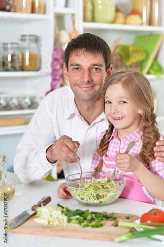 father and daughter preparing salad