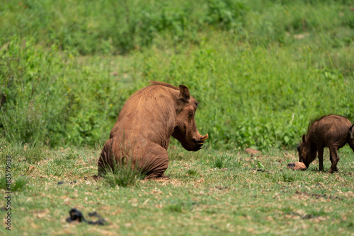 Female adult warthog vlakvark pooping in the lush green bushveld of South Africa. squeezing behind a small tuft of grass to hide its modesty.