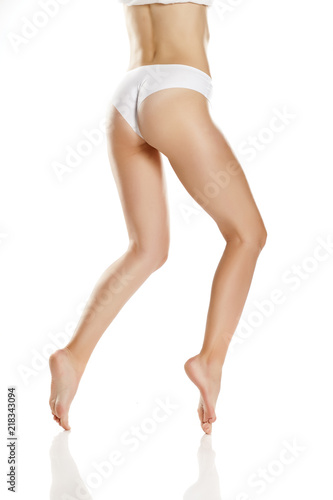 Female bare legs with white panties on white background