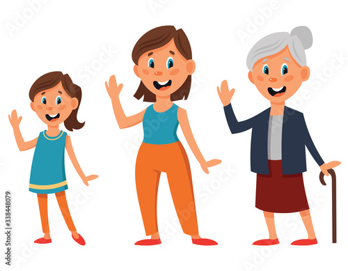 Female character of different ages. Girl, woman and old woman in cartoon style.