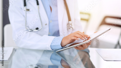 Female doctor hands using digital tablet while sitting at glass desk at hospital office. Medicine and healthcare concept