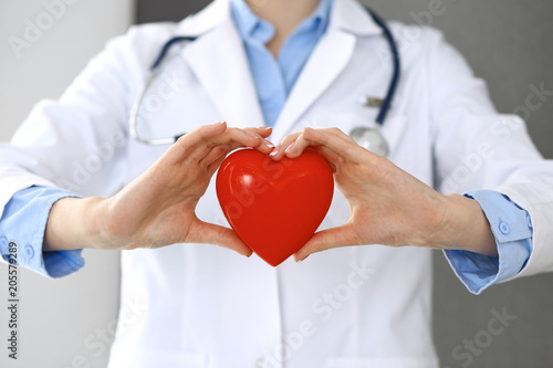 Female doctor with stethoscope holding heart in her arms. Healthcare and cardiology concept in medicine