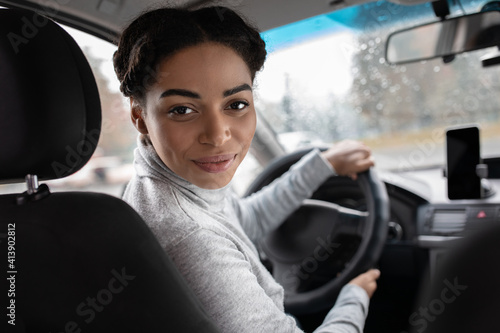 Female driver talking to passenger in back seat or auto blogger
