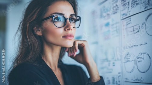 Female entrepreneur standing in her office, looking over product designs, exuding vision and confidence in her leadership.