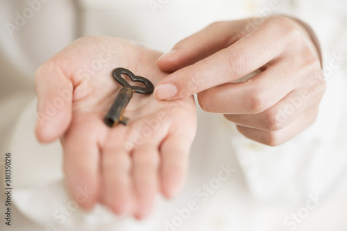 Female hand holding heart-shaped key