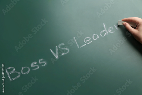Female hand with chalk and words BOSS VS LEADER on chalkboard