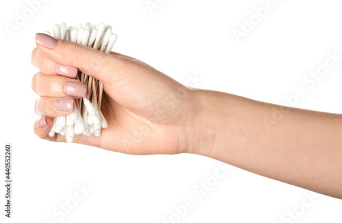 Female hand with cotton swabs on white background