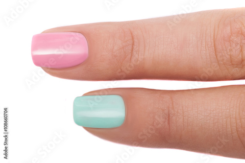 Female hand with multicolored manicure. Two finger close up