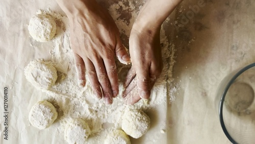 Female hands sculpting cottage cheese pancakes on cuisine table. Arms of young woman preparing tasty breakfast on desk. Process of making cheesecakes in home kitchen. Cooking healthy food concept