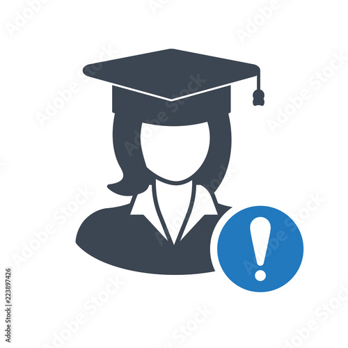 Female Student icon, graduation cap, education concept icon with exclamation mark. Student icon and alert, error, alarm, danger symbol