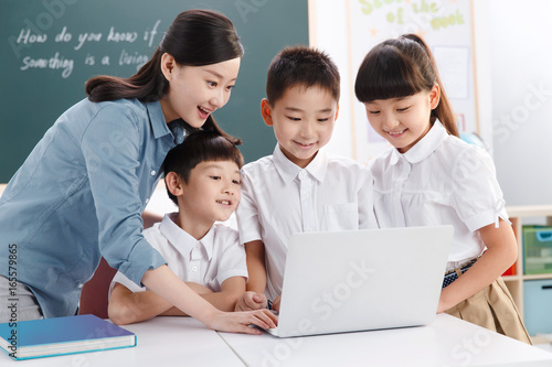 Female teacher helping students studying in classroom