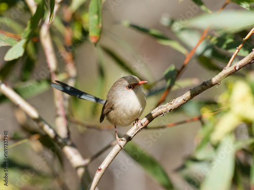 Female Variegated Fairywren (Malurus lamberti) perched on a branch with bokeh background