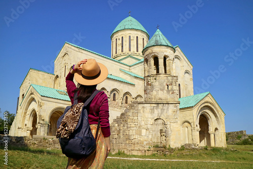 Female Visitor Being Impressed by Bagrati Cathedral, a Gorgeous Medieval Church at Ukimerioni Hilltop, Kutaisi, Imereti Region, Georgia