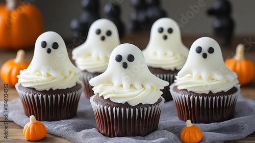 Festive chocolate cupcakes topped with fondant ghost decorations.