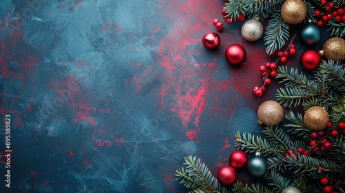 Festive Christmas Background with Decorative Ornaments and Fir Branches on Dark Blue and Red Surface