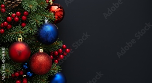 Festive Christmas Decoration Photo with Red Blue Ornaments and Greenery