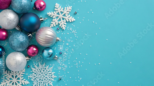 Festive christmas decorations on a light blue background with copy space