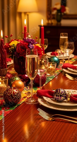 Festive Christmas dinner table setting with colorful decorations.