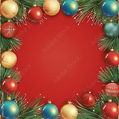 Festive Christmas frame with colorful ornaments and pine branches on a red background. Perfect for holiday greeting cards or festive designs.