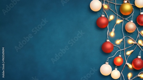 Festive Christmas ornaments and lights against a blue background, perfect for holiday celebrations and seasonal decorations.