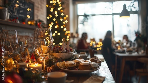 Festive Christmas table setting with desserts, candles, and bokeh lights in background.