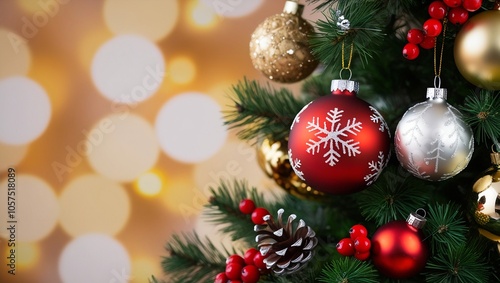 Festive Christmas Tree Close-Up with Holiday Ornaments and Warm Bokeh Background