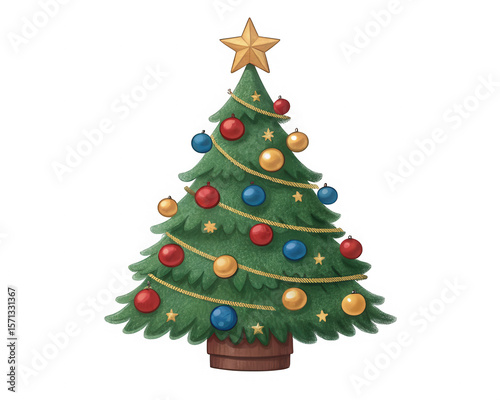 Festive christmas tree decorated with ornaments and star isolated on transparent background