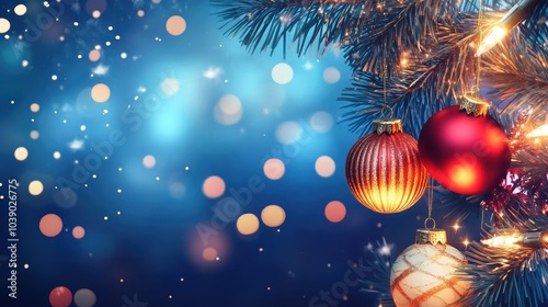 Festive Christmas Tree Ornaments and Twinkling Lights on Blue Background