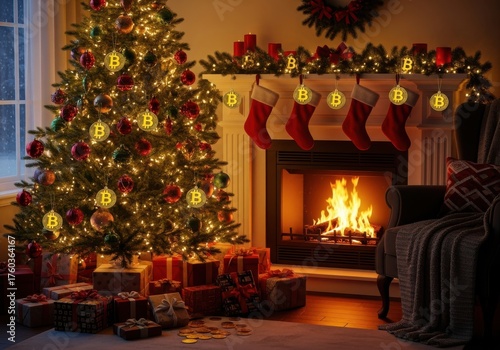 Festive cryptocurrency christmas holiday season by the fireplace ambiance