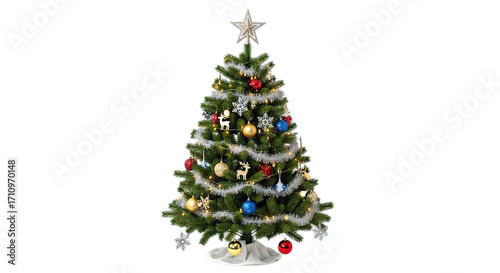 Festive Decorated Christmas Tree with Ornaments Lights Star on Top Isolated